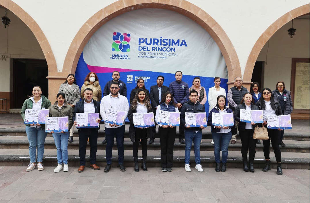 La entrega de constancias fue acompañada por la Dra. Enriqueta Martínez López Presidenta del Patronato de DIF PURÍSIMA y de integrantes del Ayuntamiento.