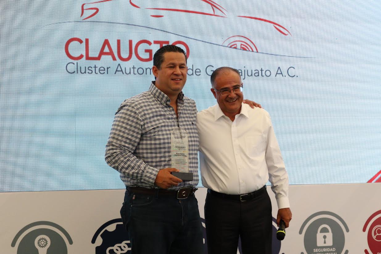 El gobernador entregó un reconocimiento a Rolando Alaniz Rosales por su gestión como presidente, deseando éxito a la nueva Junta Directiva CLAUGTO, que será liderada por Carlos Talamantes, director general de la empresa alemana Witzenmann.