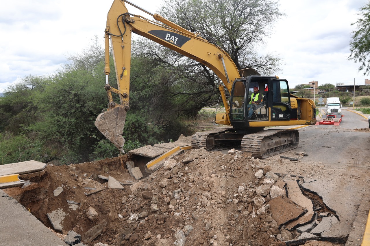 Purísima del Rincón, Gto., a 01 de julio de 2024.- Presidencia Municipal comenzó la demolición del daño estructural al camino de acceso a Loma de Obrajeros, con intención de reducir el tiempo de obra. Esto luego que la tubería del desfogue de agua se colapsó por incendios provocados de quienes queman basura o buscan encontrar acero para venderlo.