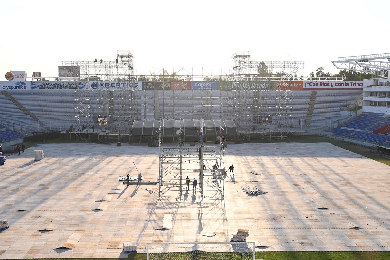 Irapuato, Gto. 04 de diciembre 2024.- El montaje del escenario donde se presentará Luis Miguel en el estadio Sergio León Chávez marcha en tiempo y forma, solo falta la instalación de pantallas y parte del audio, así lo informó el representante de Music Vive, Mario Durán, empresa involucrada en la promoción del concierto.