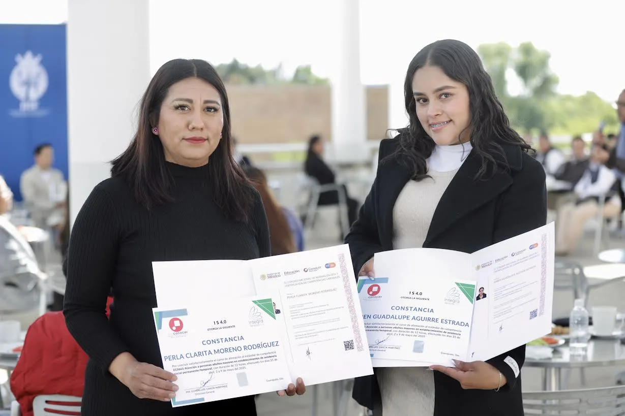 Durante la ceremonia se realizó la entrega de certificados y reconocimientos a 40 personas cuidadoras que participaron en la certificación CONOCER ECO 665, sobre Atención a personas adultas mayores en establecimientos de asistencia social permanente o temporal, y a 15 personas cuidadoras formales del sector privado y del personal de los Espacios de Desarrollo para Personas Adultas Mayores (EDPAM), quienes concluyeron satisfactoriamente la certificación ECO 669 Cuidados Básicos de la Persona Adulta Mayor a Domicilio.