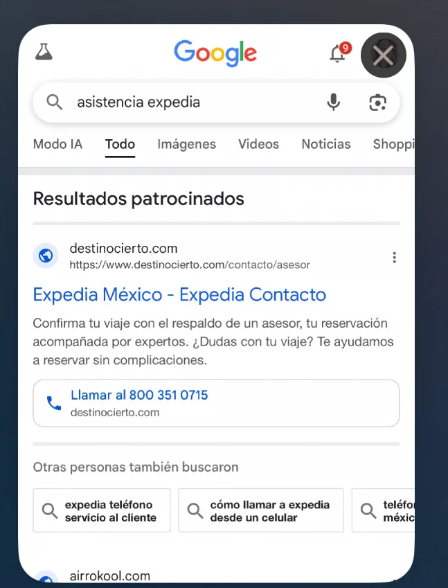 El teléfono 800-351-0715 apareció en primer lugar de los resultados en el buscador. Ella marcó y lo primero que escuchó cuando le respondieron fue “Reservaciones Expedia, buenos días, ¿en qué puedo ayudarle?”.