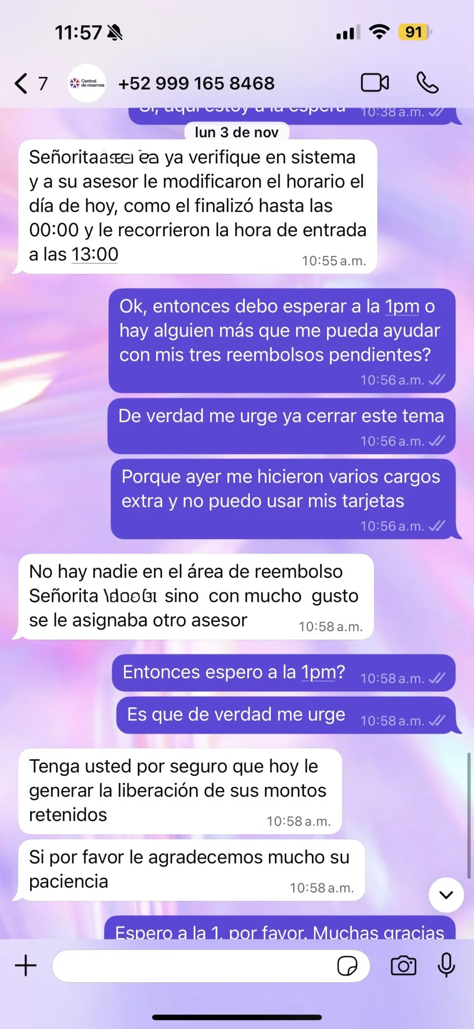 El lunes 3 de noviembre se comunicaron con ella vía WhatsApp y le dijeron que los cargos aún seguían en proceso, por eso aún no podían proceder al reembolso, además de que el agente que le estaba dando seguimiento no se encontraba en turno.