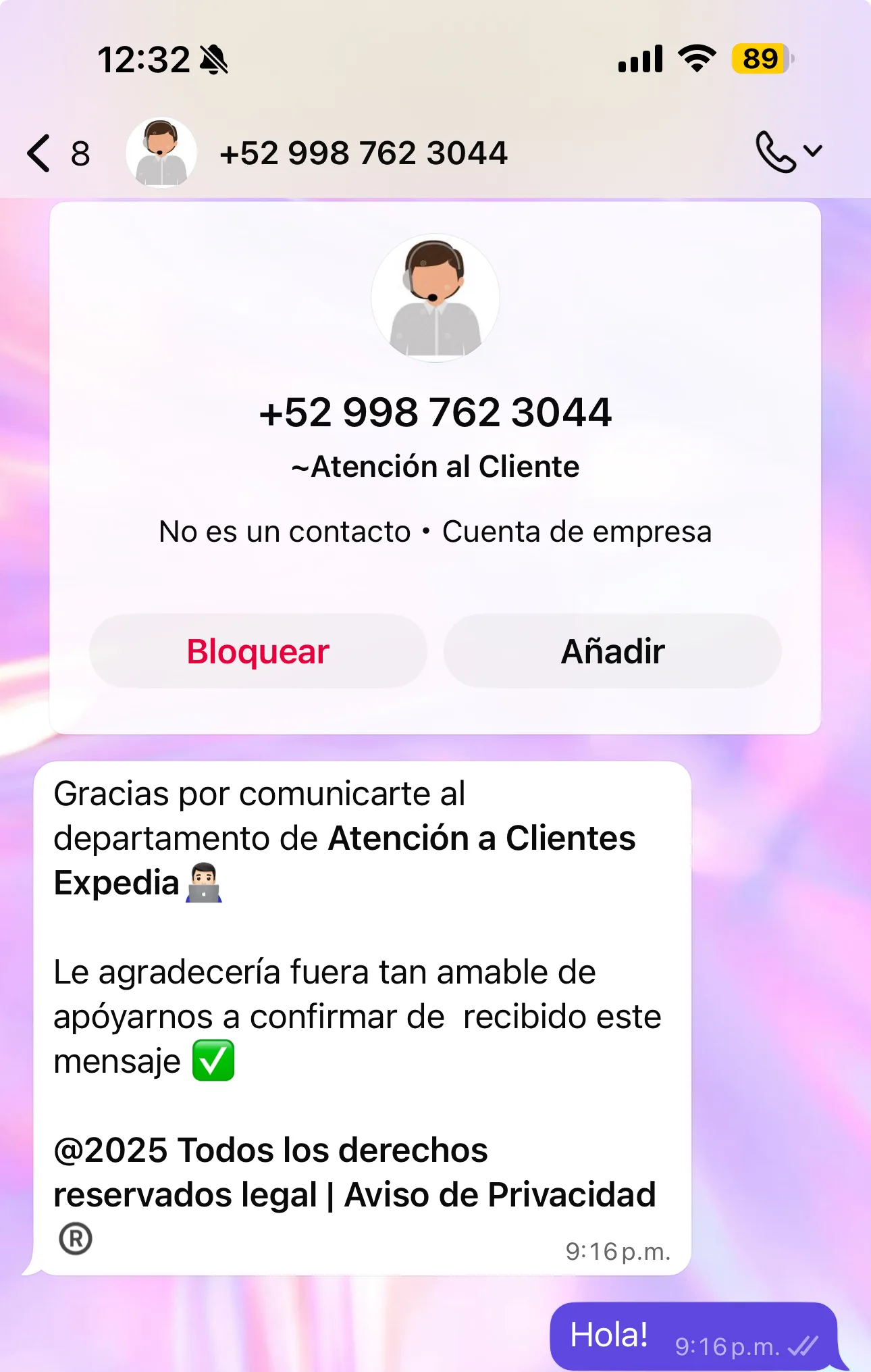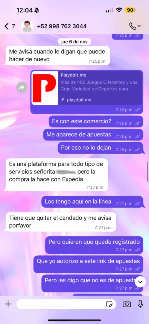 Naomi se comunicó de inmediato al número desde donde la habían estado contactando y también al supuesto WhatsApp de atención a clientes de Expedia, en ambos casos le contestaron personas que se siguen identificando como agentes de viajes de Expedia y le aseguraron que no entendían porqué el banco le había dado esa información. Ella aún guarda la evidencia de sus respuestas.