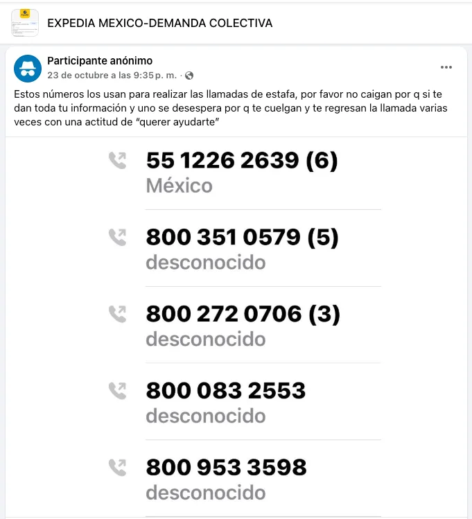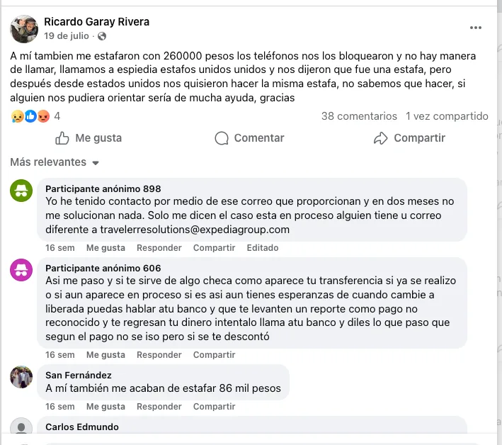El caso de Naomi no es el único. En la página de Facebook “Expedia México-Demanda Colectiva” hay más de mil 600 usuarios que reportan haber sido estafados bajo el mismo esquema que Naomi.
