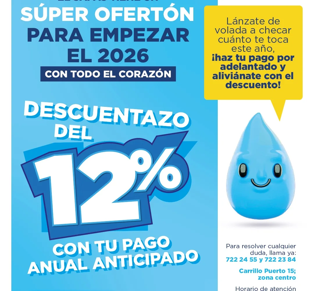 Silao, Gto.; 7 de enero de 2026.- Para empezar el 2026 con saldo positivo, el Sistema de Agua Potable y Alcantarillado de Silao (SAPAS) ofrece el descuento del 12 por ciento por el pago anual anticipado durante enero y febrero.