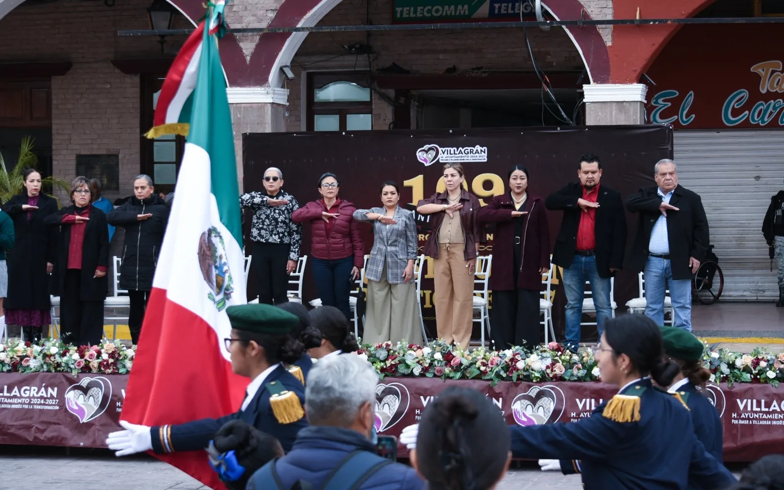 Villagrán, Guanajuato | 05 de febrero de 2025 – El municipio de Villagrán conmemoró el 109 aniversario de la promulgación de la Constitución Política de los Estados Unidos Mexicanos, dando inicio a las actividades con el izamiento de la Bandera Nacional, encabezado por la presidenta municipal Cinthia Teniente Mendoza, en compañía de integrantes del H. Ayuntamiento, con el objetivo de celebrar los principios de libertad, justicia e igualdad que rigen a nuestra nación.