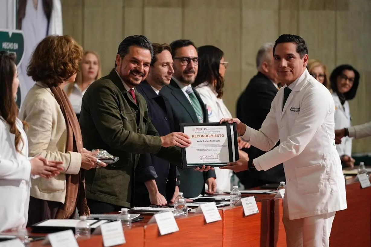 León, Guanajuato, 02 de marzo de 2026 – El director general del Instituto Mexicano del Seguro Social (IMSS), maestro Zoé Robledo, entregó al doctor Aarón Cortés Rodríguez, médico residente, el premio a la mejor tesis a nivel nacional del Área Clínica, durante el evento de Clausura e Inicio de los Cursos de Especialización Médica 2026 del IMSS, en la Ciudad de México, titulada: “Estimador de sensibilidad a la insulina de punto único como predictor de enfermedad hepática esteatósica, asociada a disfunción metabólica en adolescentes con sobrepeso y obesidad”.