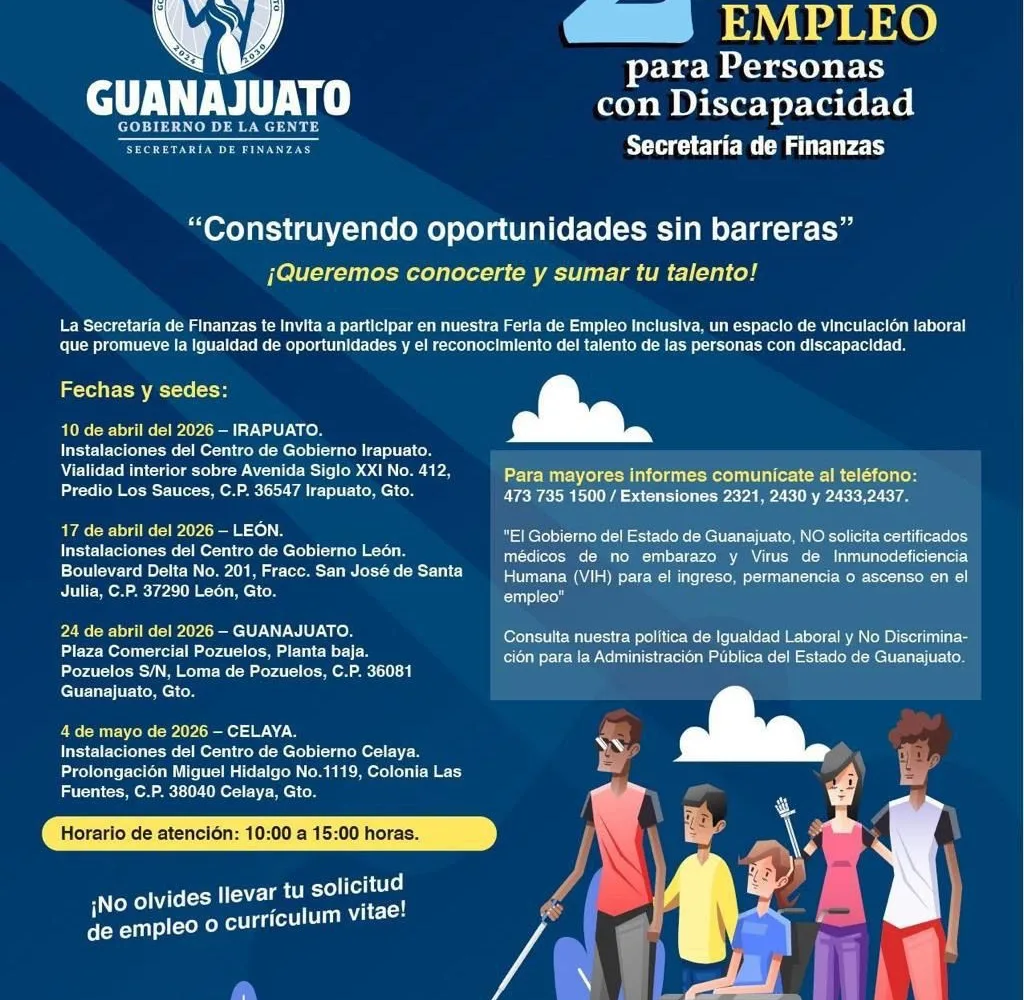 Guanajuato, Gto., a 9 de abril 2026.- Con el propósito de reconocer, atraer y sumar el talento de las personas con discapacidad, la Secretaría de Finanzas celebrará la 2da. Feria de Empleo para Personas con Discapacidad en Irapuato, León, Guanajuato y Celaya.